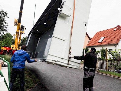 Der fertige Pool wird mit einem Spezial LKW auf die Baustelle transportiert und mit einem Kran in die Baugrube gehoben (betonierte Bodenplatte als Untergrund). Einbauteile und Leitungen werden angeschlossen und nachdem der Pool etwas mit Wasser gefüllt wurde, kann außen herum schon die Anfüllung mit Magerbeton beginnen.